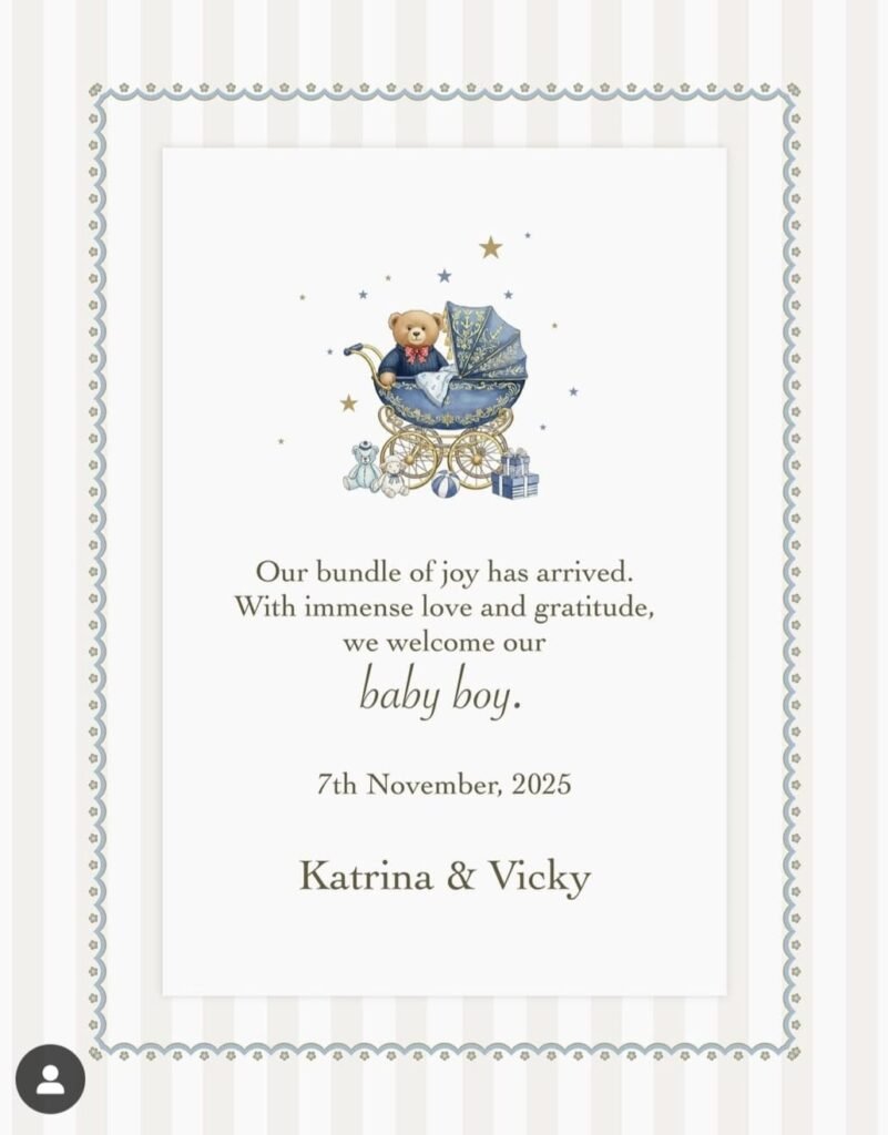 विक्की कौशलनं इन्स्टाग्रामवर एक पोस्ट शेअर केली. त्यानं लिहिलंय की, “आमच्या आनंदाचं आगमन झालंय… अपार प्रेम आणि कृतज्ञतेनं, आम्ही आमच्या मुलाचं स्वागत करतोय… 7 नोव्हेंबर 2025… कतरिना आणि विक्की…”