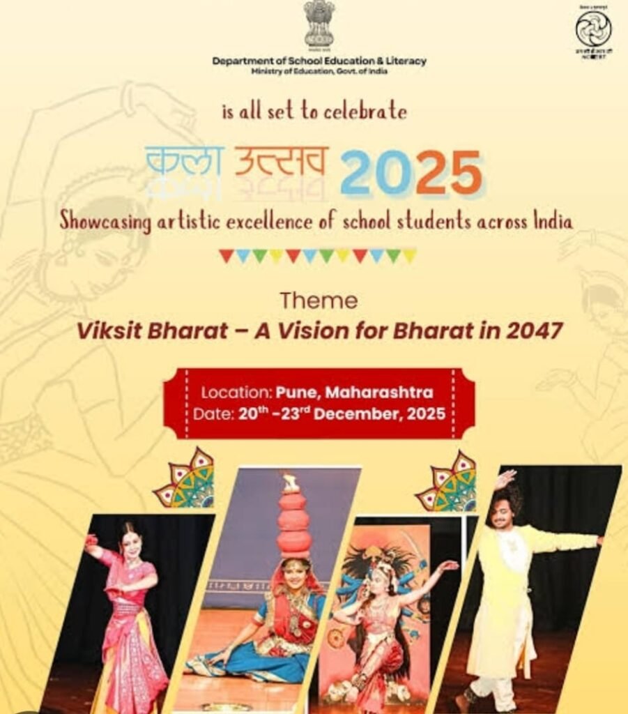 पुणे, दि. १९ : भारत सरकारच्या शिक्षण मंत्रालयाचा महत्त्वपूर्ण उपक्रम असलेला ‘राष्ट्रीय कला उत्सव २०२५’ यावर्षी पुण्यात आयोजित करण्यात आला आहे. शनिवार २० ते मंगळवार २३ डिसेंबर या कालावधीत यशवंतराव चव्हाण विकास प्रशासन प्रबोधिनी (यशदा), पुणे येथे हा चारदिवसीय उत्सव रंगणार आहे.